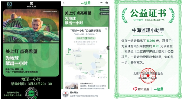 中海監理積極回應環保號召,成功舉辦「地球一小時」線上公益捐步活動。本次活動不僅倡導員工在指定時間內關閉非必要燈光,更鼓勵他們走進自然,以步行的方式投身公益事業。員工的每一步均可轉化為公益金,由中海監理提供支持,最終匯聚至「衛藍俠守護碧水藍天」環保項目。此次活動的開展,不僅在員工心中深植低碳環保的理念,也彰顯了我們為地球生態環境作出貢獻的决心,共同呵護我們寶貴的自然資產。