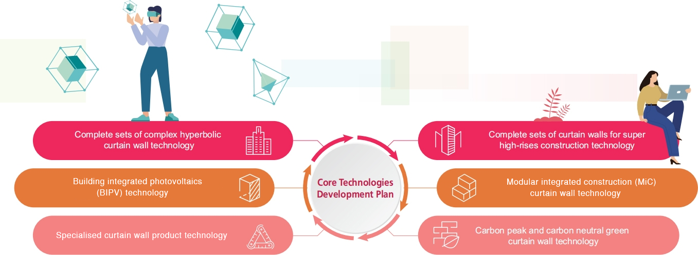 The Group sets up an "Annual Innovation and Technology Work Plan" every year to stipulate its internal technology work plan and establish R&D projects related to curtain walls, supervision and thermoelectricity businesses, including formulating technology project content list, result list, major milestones, number of patent and construction method applications, number of technology R&D and R&D funding amount, so as to expand the application and research of various technologies, such as artificial intelligence, Internet of Things and big data, virtual reality and augmented reality, project integrated management system (PIMS), establishment of intelligent management system, etc.