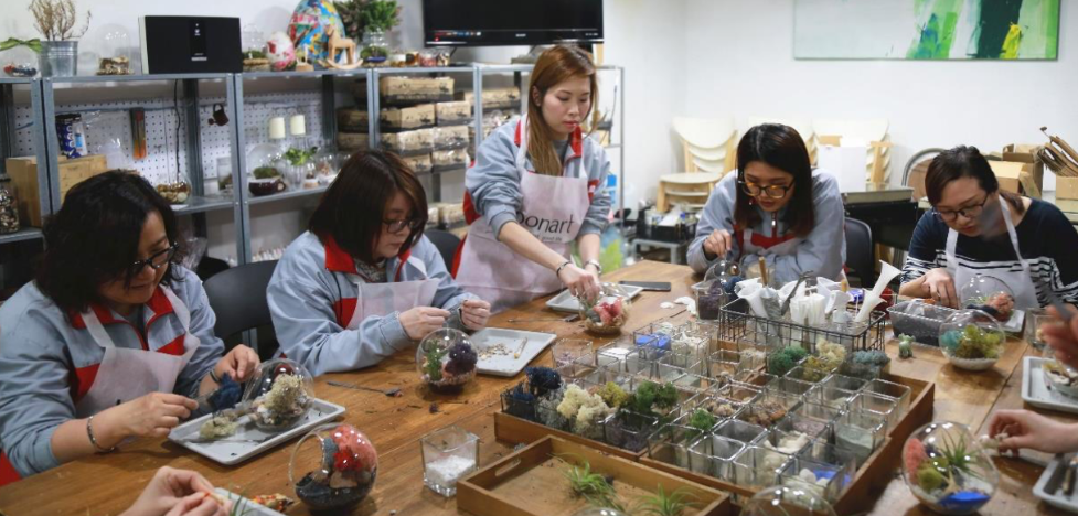 Under the guidance of three instructors, our staff first received brief introduction of some examples. Then, they started to collect materials from the stock and carefully design their “small world”. They played with their creativities by using different colors, shapes, positions of the plants and figures. The studio was full of laughter and fun.