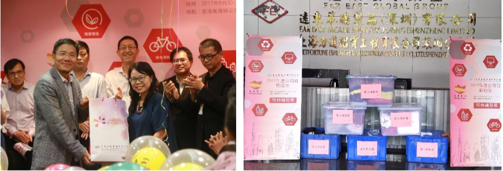 This Company Day was titled as “Sustainable Development” and divided into five different series of activities: “Green Guidance” to set up management system, “Trash to Treasure” to recycle waste, “Peace Communion” to care for society, “Health and Go Green” to practice actively, “Carbon Reduction” to reduce office paper usage. During the Company Day, the opening ceremony was holding along other subsidiaries with webcam connection at the same time, it included Far East employees’ greetings, Top Management’s opening speech, clothing donation, signing the “Far East Caring Shirt”, watering the “Far East Caring Tree” and other activities to warm up the event. In the end, the opening ceremony ended with Far East employees’ birthday greetings from different cities in Mainland China. Employees got to play games, chat together, enjoy delicious snacks and receive different prizes with their friends and families.