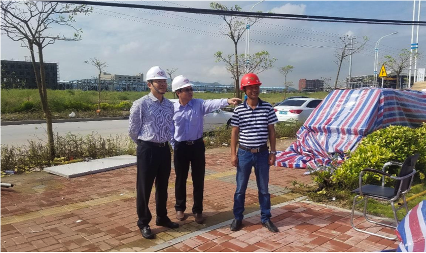 On August 29, 2017, Far East Global Group’s CEO, Mr. Zhu Yijian visited the construction site after typhoon and conveyed greetings to employees in the morning. Mr. Zhu was impressed by the construction team’s disaster prevention and post-disaster work. He also suggested a few precautions and guided the production arrangements. Mr. Zhu explained three main substances according to the post-disaster work: first, to prevent the turn up of another disaster afterwards; second, to speed up the repair of the damaged infrastructure; third, to recover our daily construction as soon as possible.