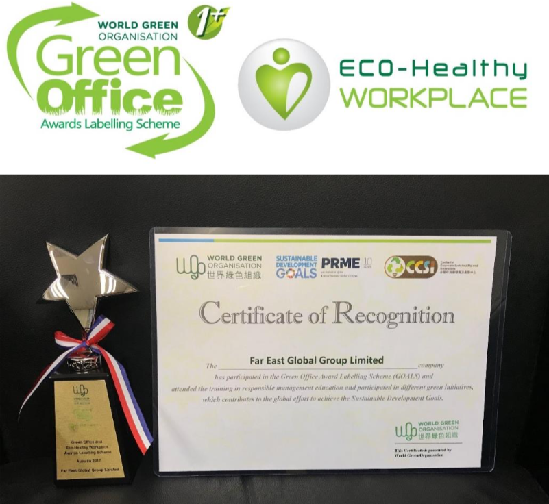 On November 20, 2017, Far East Global Group (refer as FEGG) was awarded the “Green Office” label by World Green Organization’s Green Office Award Labelling Scheme (GOALS) for the second year. Since the company has been putting efforts on a healthy workspace, FEGG was awarded the “Eco-Healthy Workplace” label at the same time.
